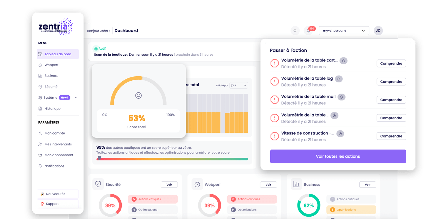 Zentria vous offre une vision claire et immédiate de votre boutique : performances, sécurité, paiements, transport et signaux business clés. Véritable sentinelle, Zentria détecte les anomalies, révèle les optimisations possibles et vous montre ce que vous ne voyez pas.