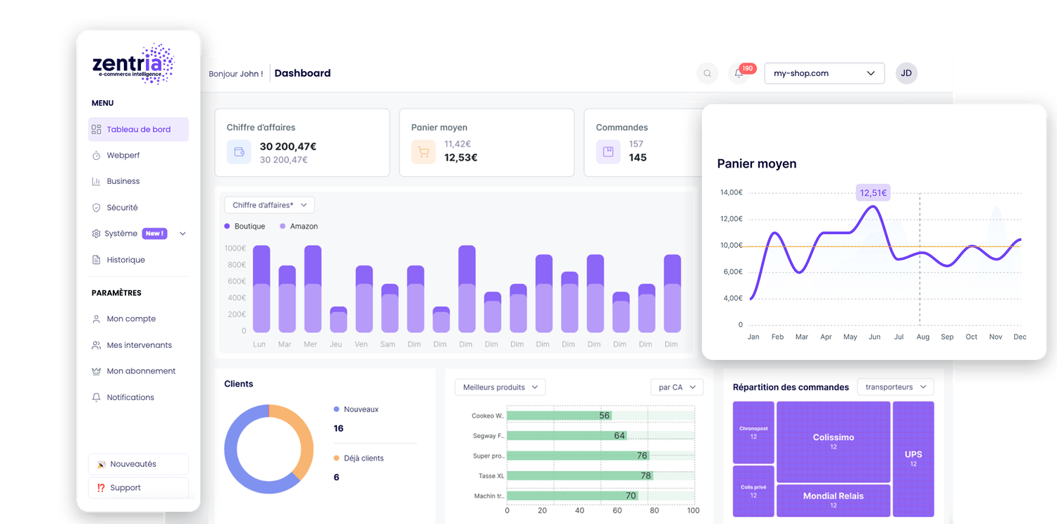 Zentria surveille vos indicateurs clés : paiements, transporteurs, commandes, nouveaux clients et éléments SEO. Vous êtes alerté avant qu’un blocage ne coûte une vente.